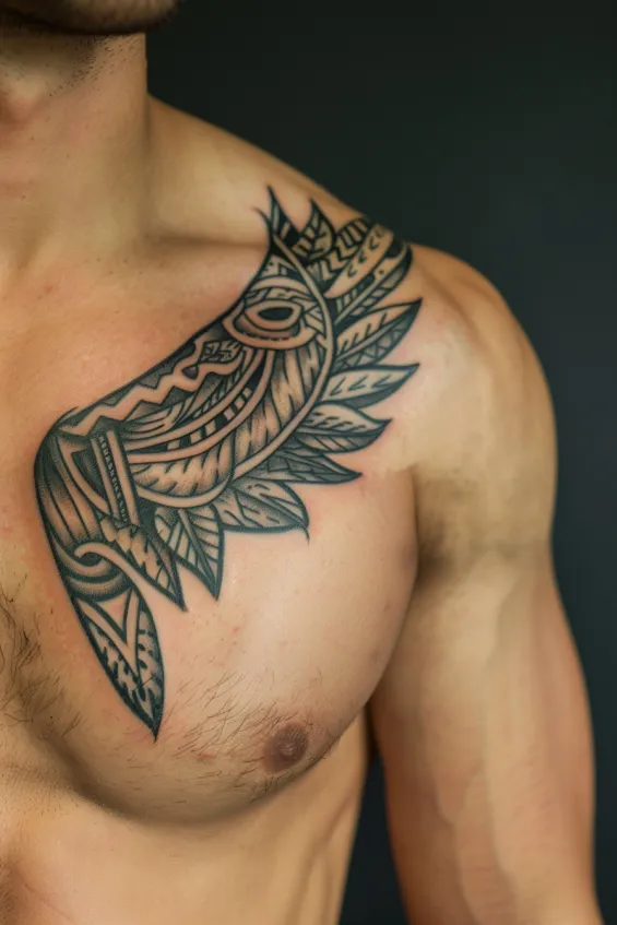 This striking tattoo features a bold tribal-inspired wing design that stretches across the shoulder and onto the chest. The intricate patterns within the wing give it a deeply symbolic and cultural feel, blending geometric shapes with the natural flow of feathers. The thick blackwork lines add strength to the design, making it stand out while still complementing the contours of the body.