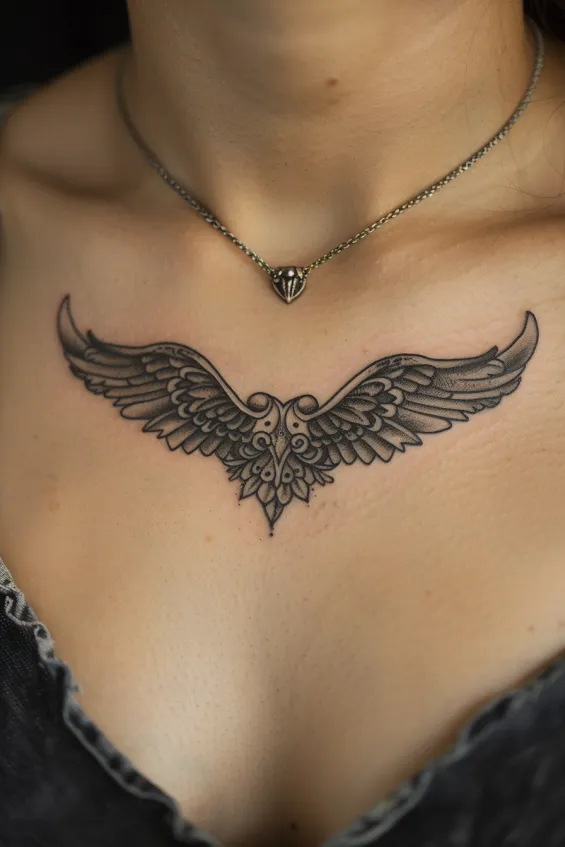 A bold yet intricate design, this chest tattoo blends elegant wings with the symmetrical beauty of an owl. The wings stretch gracefully across the collarbone, creating a balanced and striking look. Fine line shading and ornamental detailing add depth, making the wings feel almost weightless. The central owl design, with its piercing symmetry, gives a sense of wisdom and strength while maintaining a soft, decorative aesthetic.