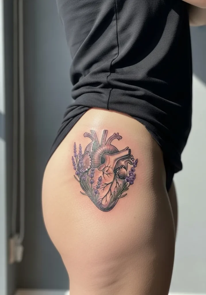 This hip tattoo features a softly shaded anatomical heart surrounded by lavender sprigs in muted purple tones. The placement lets the flowers curve naturally around the shape and the shading on the heart keeps it realistic but still warm. The colors are calm which makes the whole piece feel soothing.