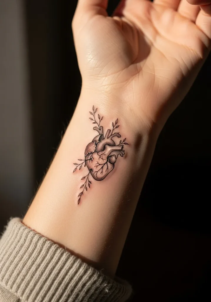 This small wrist tattoo mixes a fine line anatomical heart with thin branches that peek from behind the vessels. The light shading keeps everything soft and the tiny leaves add a sweet natural touch. The placement stays subtle which makes the design feel intimate and personal.