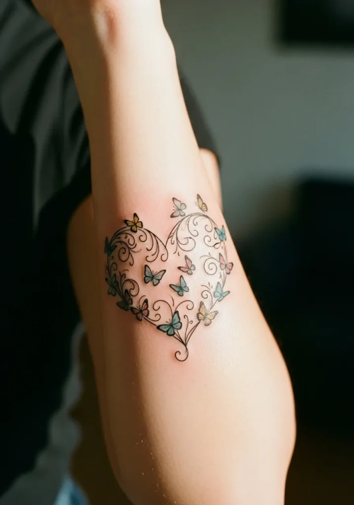 This design wraps elegant swirls and tiny colorful butterflies into the shape of a heart placed near the inner arm. The thin lines keep everything airy while the scattered wings bring a playful touch. Gentle shading gives the heart movement without losing that dreamy lightness.