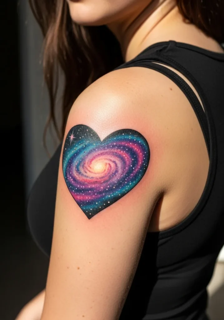 This shoulder tattoo turns a heart shape into a swirling galaxy filled with bright pinks, deep blues and tiny stars. The center glows with soft yellow light that slowly blends into the rest of the colors. The smooth shading gives the heart a dreamy cosmic look and the placement lets it stand out beautifully.