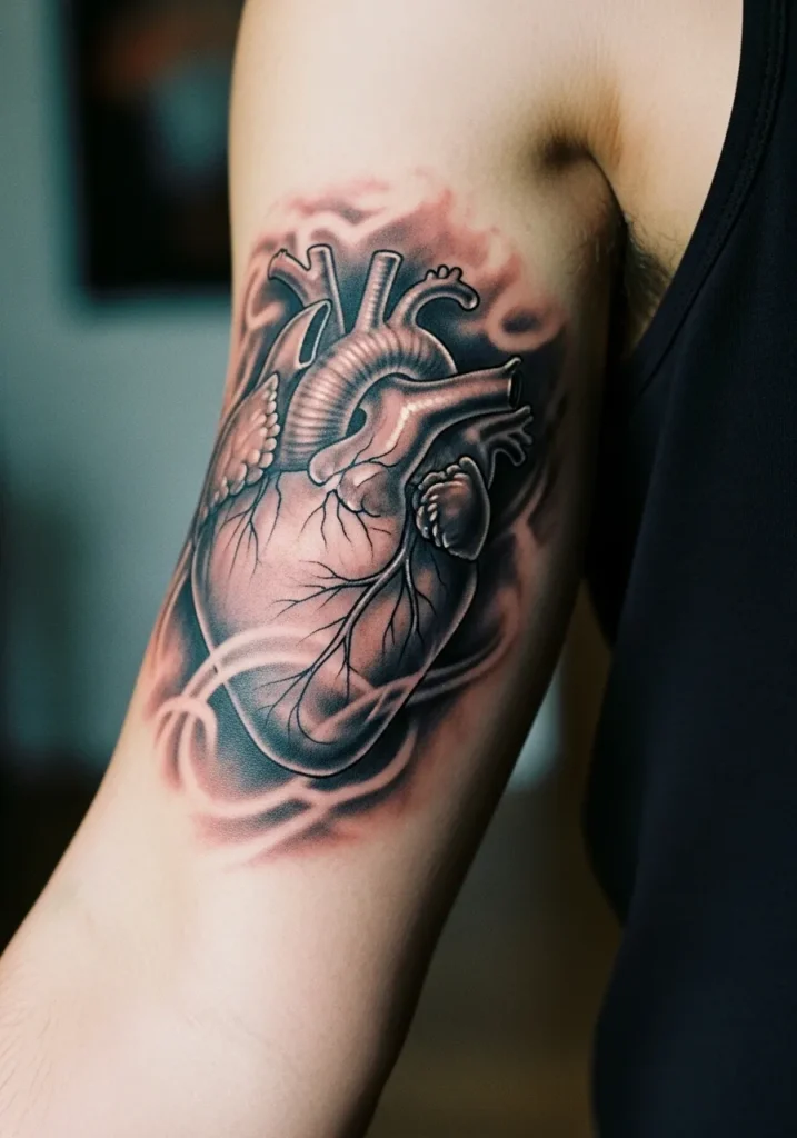 This upper arm tattoo shows a highly detailed anatomical heart with rich shading that gives it a bold three dimensional look. Soft smoky clouds swirl around the edges which makes the shape pop even more. The size is on the larger side and fills the arm beautifully with smooth lines and dramatic depth.