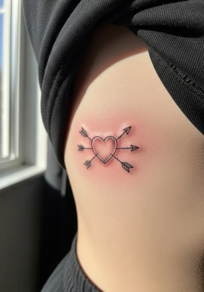 This small side-rib tattoo uses fine line strokes to form a simple heart with delicate arrows pointing outward. The light pink blush around the outline adds a fresh look that feels soft and charming. The size stays tiny which gives the placement a subtle and personal feel.