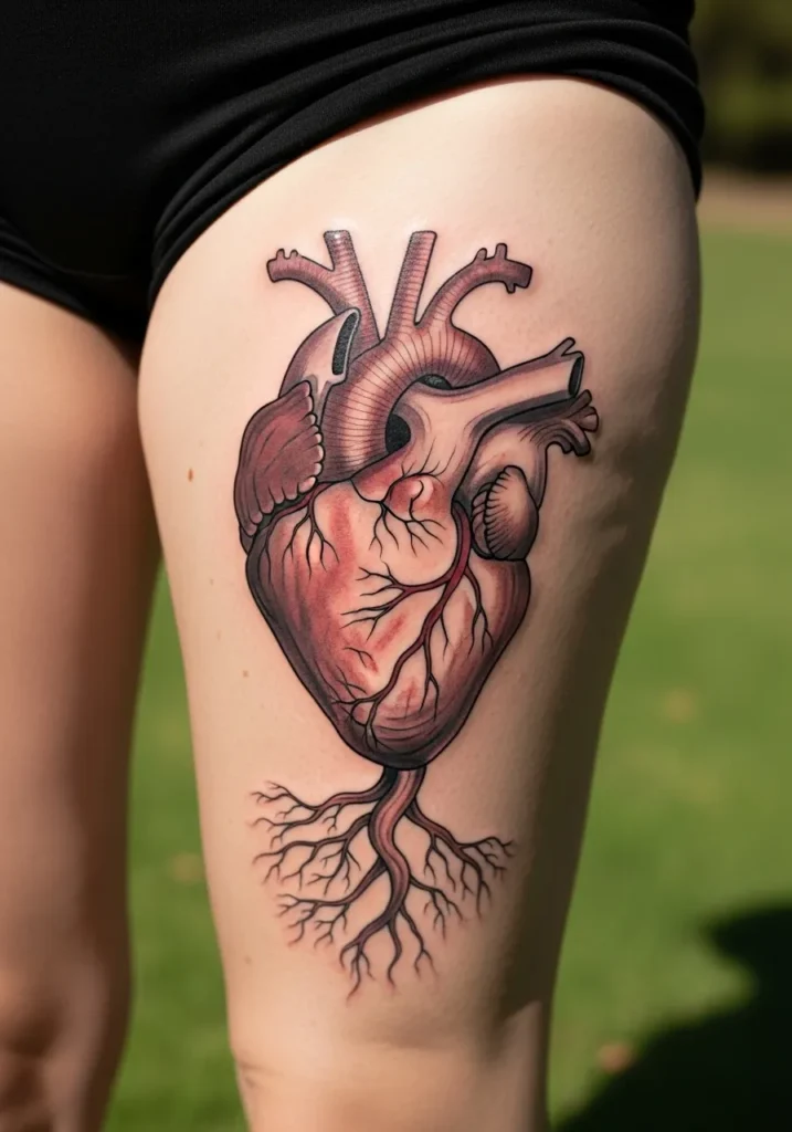 This thigh tattoo features a realistic anatomical heart with rich red shading and dark outlines that add depth. At the bottom the arteries stretch downward into delicate branching roots that press into the skin which creates a powerful grounding effect. The large size lets every detail stand out clearly.