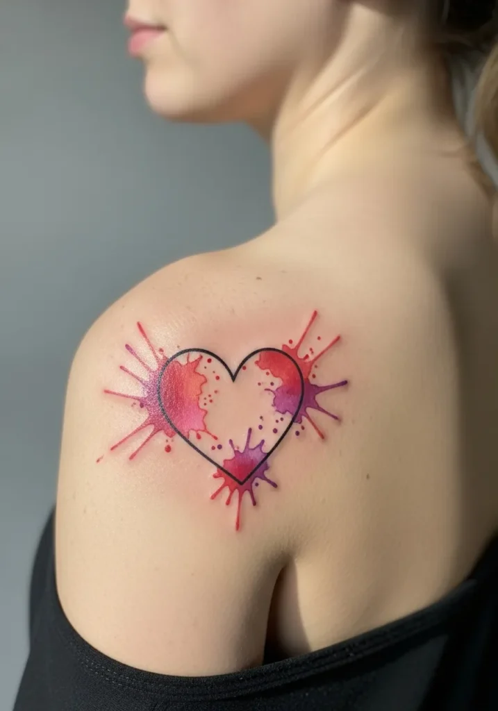 This shoulder tattoo uses bright pink and purple splashes that frame a thin black heart outline. The loose edges make the colors feel playful while the soft glow around the ink gives it a fresh look. The medium size works nicely across the shoulder curve.