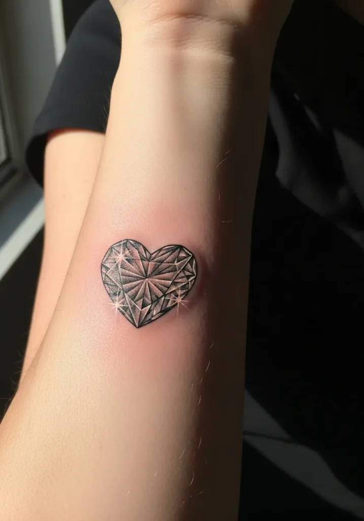 This wrist tattoo looks like a tiny crystal heart with clean geometric cuts and bright highlights that make it look like it is catching sunlight. The light black and gray shading adds depth without losing the delicate feel. The small size makes it even more charming and the little sparkles give it a magical touch.