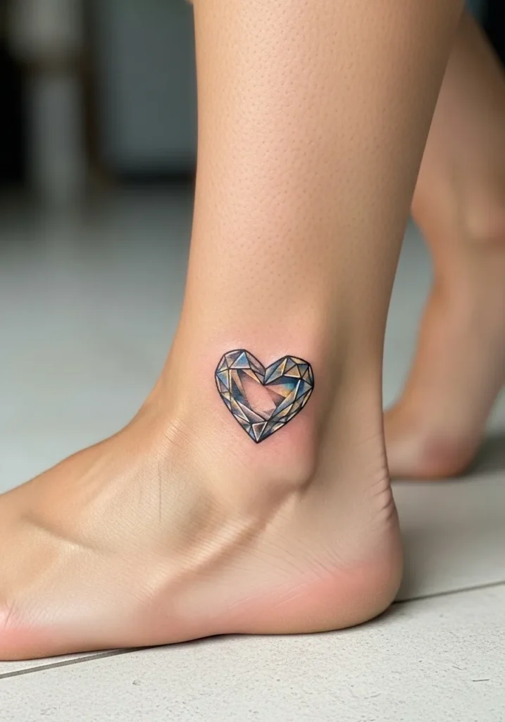 This ankle tattoo features a small faceted heart shaped gem with soft gray shading and pale hints of blue and gold. The geometric cuts catch the light so well that the whole design almost sparkles. The tiny size fits the ankle perfectly and makes the piece feel delicate and chic.