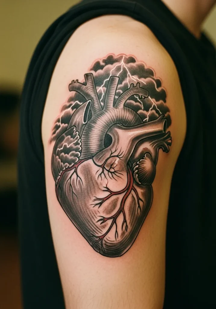 This upper arm tattoo shows a bold anatomical heart with deep shading that gives the vessels and curves a strong sculpted look. Dark storm clouds rise behind it with bright lightning streaks that stand out against the black and gray tones. The size covers the arm beautifully which makes the heart feel powerful and full of motion.