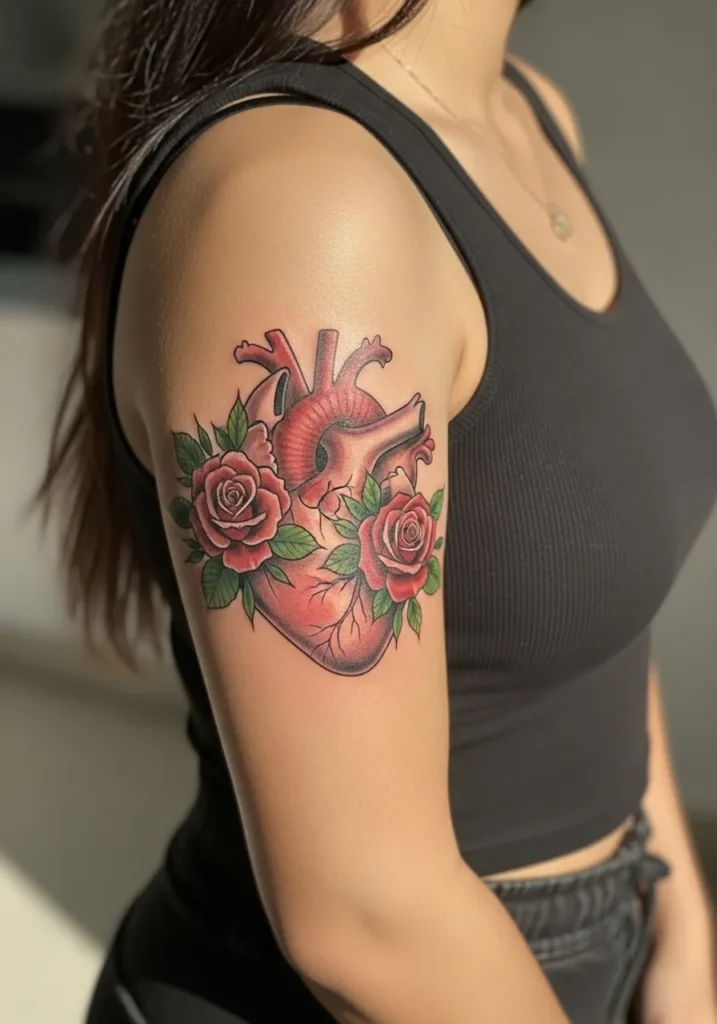 This upper arm piece blends a bright anatomical heart with two soft red roses and leafy green accents. The medium size fills the shoulder curve in a lovely way while the smooth shading gives the heart a gentle glow. The petals sit close to the vessels which makes the whole design feel warm and natural.