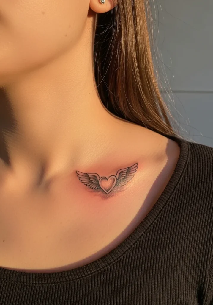 This collarbone tattoo features a tiny heart with soft wings that stretch outward in a gentle curve. The shading stays light which gives the wings a feathery look and the blush of pink around the ink adds a warm glow. The small size sits perfectly in that delicate spot above the chest which makes the whole piece feel subtle and sweet.