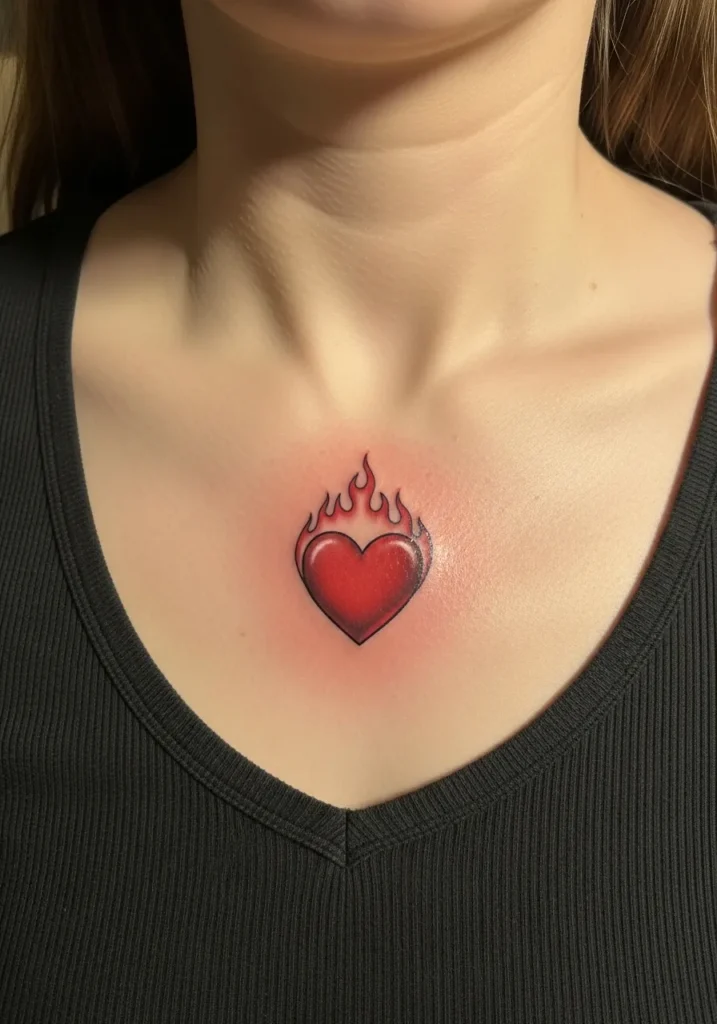 This small chest tattoo features a bright glossy heart with tiny flame shapes rising from the top. The shading makes the red color look sweet and shiny while the soft blush around the ink gives it that fresh warmth. The size sits perfectly between the collarbones which adds a cute bold touch.
