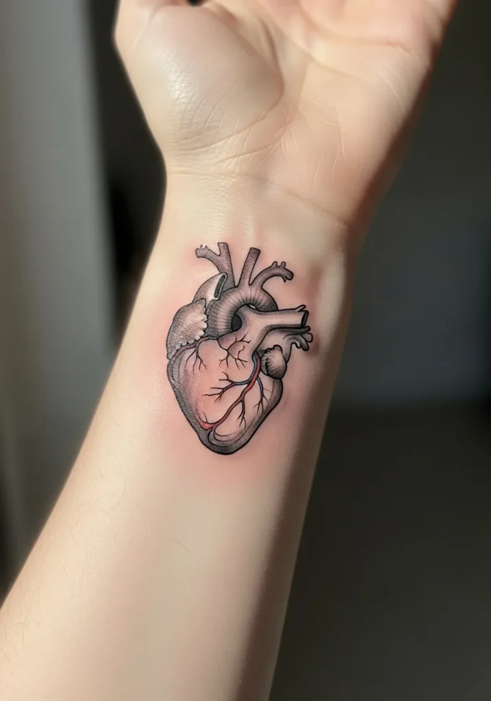 This small wrist tattoo shows a softly shaded anatomical heart with clean fine lines and gentle highlights that give it a realistic yet simple look. The blush around the ink makes it feel fresh and warm while the size stays tiny and refined.