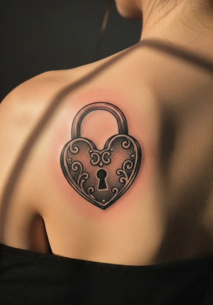 This back shoulder tattoo features a heart shaped lock with ornate metalwork details and soft highlights that create a realistic metallic shine. The keyhole sits right in the center which adds a romantic touch. The shading blends smoothly across the shoulder and the size sits perfectly for a statement piece.