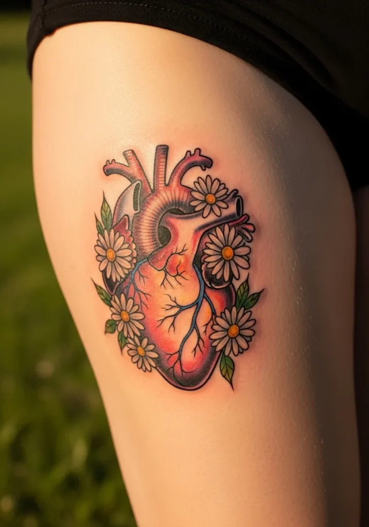 This thigh tattoo pairs a glowing anatomical heart with cheerful daisies and leafy green accents. The warm shading makes the veins and vessels stand out while the flowers soften the entire look. The larger size gives the design room to shine.