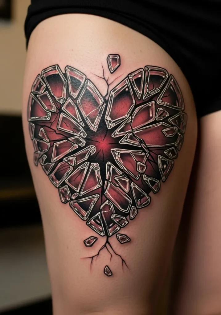 This thigh tattoo forms a bold heart made of sharp glass like fragments with each piece shaded in deep reds and blacks that fade toward the center. The edges look raised which gives the shattered effect even more dimension and a few loose pieces fall beneath the heart for an extra dramatic touch. The size fills the thigh beautifully which lets all the tiny cracks and highlights stand out.