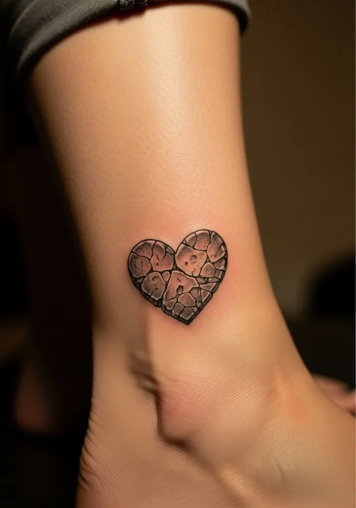 This small ankle tattoo uses realistic stone shading to create a cracked heart made of tiny textured pieces. The muted brown tones look natural on the skin and the crisp outline helps each fragment stand out. The size stays compact which suits the ankle so well.