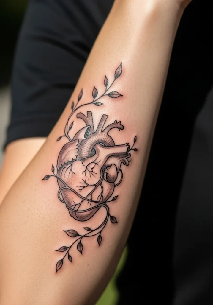 This forearm tattoo shows a soft shaded anatomical heart wrapped in delicate vines with small leaves that frame the shape. The fine line style keeps everything airy and the gentle dot shading gives the heart a smooth glow. The medium size fits the arm so well and the flowing vines make the whole piece feel graceful.
