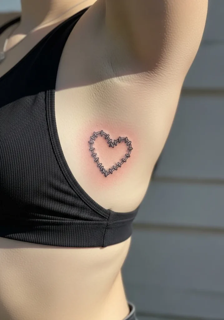 This side rib tattoo shows a heart shape formed entirely by tiny stitched segments. Each section is shaded lightly to look raised and the soft pink glow underneath gives it a tender freshly healed look. The size stays small which fits the placement perfectly.