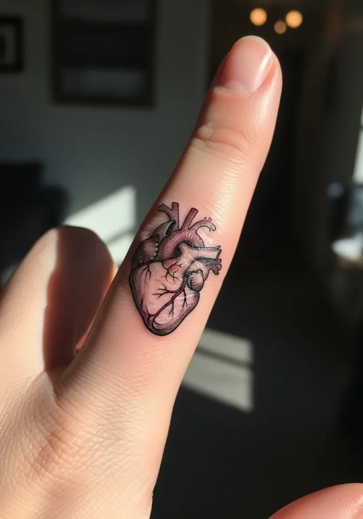 This small realistic heart sits neatly on the side of the finger with fine lines showing tiny vessels and gentle shading creating soft dimension. The light patch of redness around it makes the design look freshly done which adds to its authenticity. Despite the tiny size the detail is surprisingly sharp.