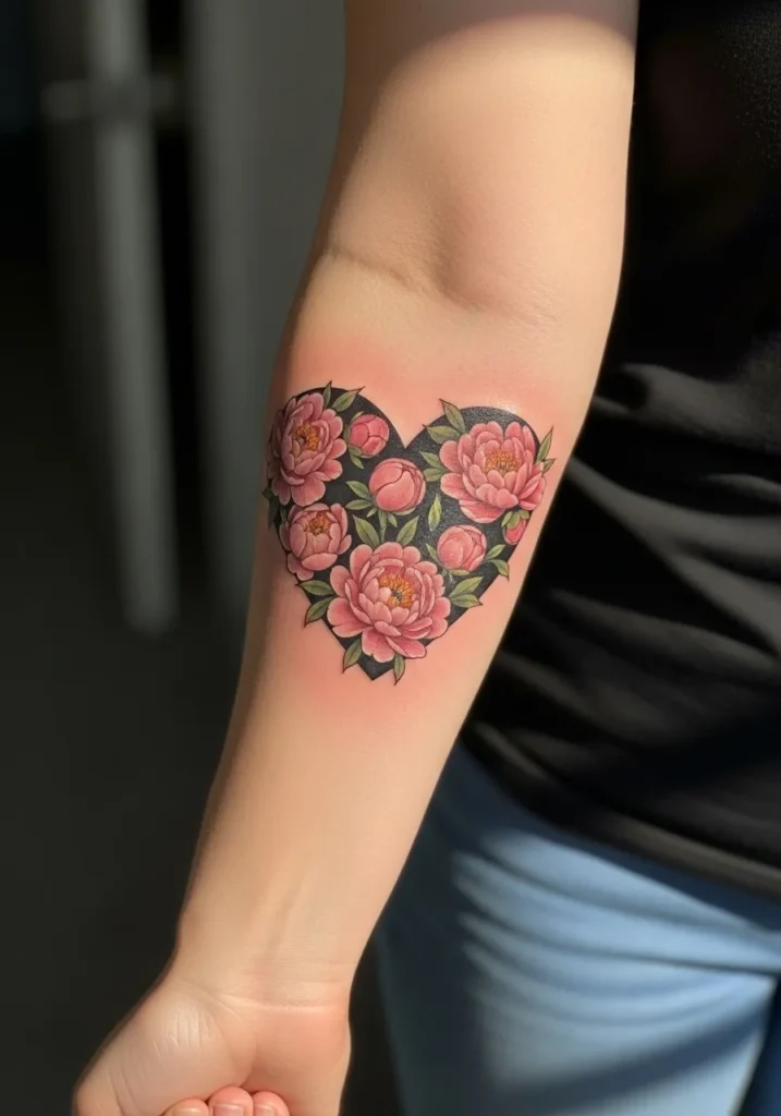 This forearm tattoo uses a deep black heart silhouette filled entirely with soft pink peonies and leafy green accents. The petals are shaded beautifully which gives each flower depth while the dark background makes the colors stand out. The medium size frames the blooms in such a lovely way.
