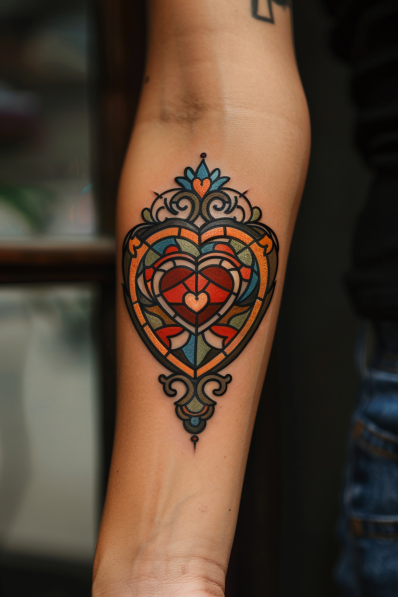 This tattoo is a vibrant, intricate masterpiece resembling a stained glass window with a heart at its center. The bold lines and rich colors deep reds, oranges, blues, and yellows come together to form a mosaic-like design that s truly eye-catching. The ornamental details framing the heart add to the design s regal and elegant feel, giving it a sense of depth and artistry. The tattoo almost glows, much like real stained glass when hit by sunlight.