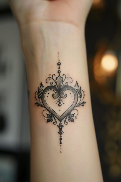 This tattoo features a stunning heart design adorned with vintage-inspired filigree patterns and delicate dot accents. The symmetrical swirls give it a classy, ornamental look, while the subtle shading adds depth and dimension to the piece. It s beautifully detailed without being overly complicated, making it a perfect balance of elegance and simplicity.