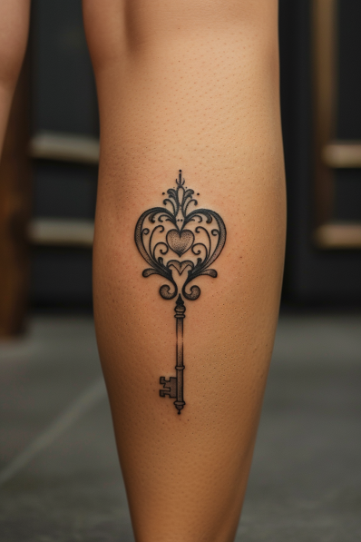 I m a big fan of how this tattoo plays with symbolism. Keys are often seen as unlocking something important, and pairing that with a heart just amplifies the meaning. It s classy without being too flashy, and the placement on the calf makes it easy to show off or keep hidden depending on your mood. Plus, who wouldn t love having a secret, beautifully designed key right on their skin? It s a tattoo that feels personal, almost like it s guarding a little secret.