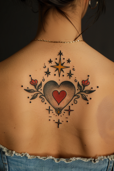 This tattoo is a beautiful take on the sacred heart design, surrounded by stars and celestial elements. The central heart has a soft, shaded look, with a bold red core and a glowing golden star above it. Floral vines with delicate red buds stretch from either side of the heart, adding a natural, feminine touch to the otherwise mystical vibe. The small stars and dots scattered around the design make it feel almost like a constellation, giving it a dreamy, cosmic atmosphere.