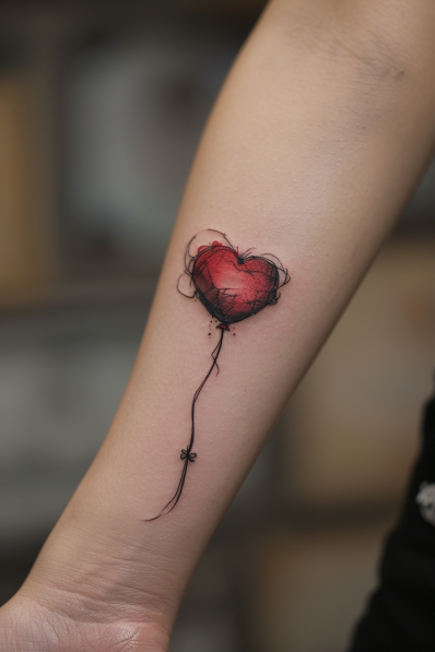 This tattoo features a beautifully artistic, sketchy heart that resembles a floating balloon. The heart itself is filled with vibrant shades of red, while the black sketch lines give it a raw, hand-drawn look. A thin string dangles from the heart, tied with a tiny bow, adding a whimsical touch to the overall design. The combination of the messy sketch style and the delicate string gives the tattoo a feeling of lightness and freedom.