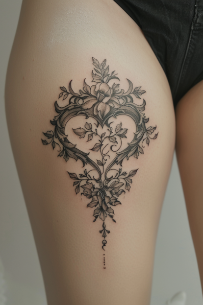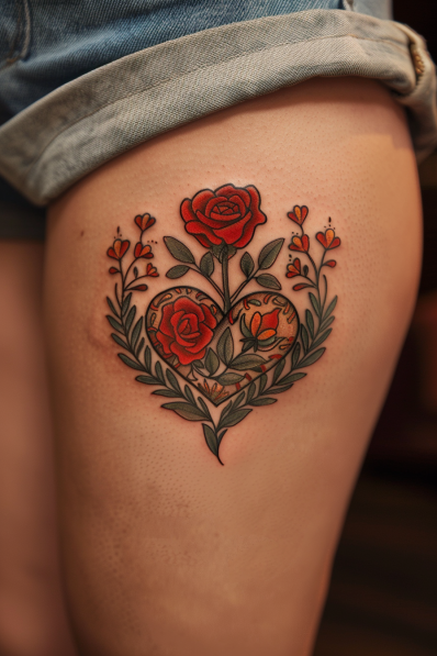 This tattoo beautifully merges the heart shape with a nature-inspired floral theme. The heart is formed by delicate vines and leaves, with vibrant roses blooming inside and around it. The main red rose on top gives the design a regal, romantic feel, while the smaller buds and foliage create a balanced, symmetrical composition. It sits elegantly on the thigh, adding a touch of classic beauty to a bold placement. It s soft yet striking perfect for someone who wants to wear their love for nature and romance on their skin.