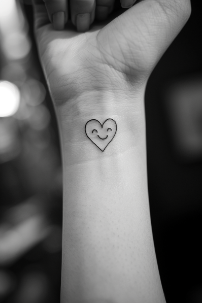 This tattoo keeps it simple and sweet, featuring a tiny heart with a smiling face placed neatly on the wrist. The minimalist design uses clean, thin lines to form the heart, while the happy expression gives it a lighthearted and playful touch. It s a small tattoo, but its charm comes from its simplicity and the positive vibe it exudes.