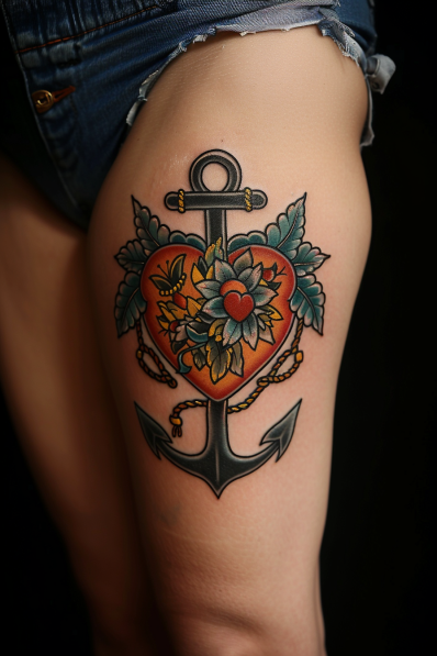 This bold tattoo combines the classic symbol of a heart with a strong anchor, representing both love and stability. The heart is vibrant, with shades of red and orange, and is decorated with a detailed flower in the center. The anchor is drawn in a traditional tattoo style, giving the design a timeless, nautical vibe. Surrounding the heart are leaves and a rope that twists around the anchor, adding depth and a subtle touch of nature to the piece. The combination of floral and nautical elements makes this tattoo stand out as both tough and tender.