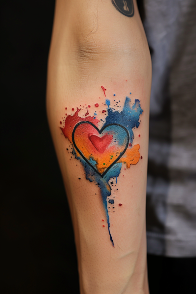 This tattoo is pure art! It features a vibrant heart in the center, framed by an explosion of watercolor splashes in shades of red, blue, orange, and yellow. The blurred edges and paint-splatter effect give it a dynamic and energetic feel, as if the heart is bursting with emotion. The design is beautifully chaotic, and the use of color really makes it pop against the skin. Placed on the forearm, it s the kind of tattoo that s sure to grab attention and bring a little color to your day.