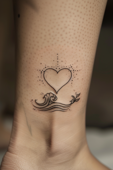 This tattoo captures the essence of simplicity and elegance with a minimalist heart floating above gentle ocean waves. The thin, clean lines give it a delicate look, while the small dots around the heart add a subtle sparkle, almost like stars twinkling in the sky. The waves beneath the heart are soft and flowing, creating a peaceful and calming vibe. It s the perfect blend of love and serenity, captured in a clean and understated design.