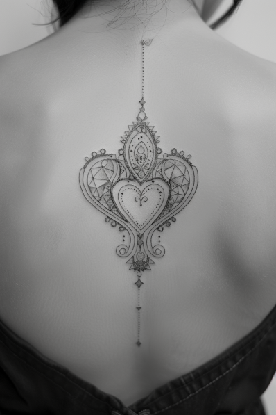 What makes this tattoo stand out to me is its stunning precision and placement. I love how the heart is the focal point, surrounded by such fine, intricate details that make the whole piece look sophisticated and timeless. The placement along the spine is not only visually striking but also gives the tattoo a sense of depth and balance. It s the kind of design that feels personal and meditative, combining beauty with a deeper meaning. This one s a real showstopper!