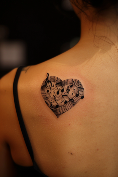 This tattoo is perfect for music lovers, featuring a heart composed of musical notes, treble clefs, and a flowing staff. The design creatively wraps the sheet music into a heart shape, blending love and passion for music seamlessly. The fine black lines give the tattoo a delicate and harmonious look, with the notes dancing across the heart, symbolizing the rhythm and melody of life. Placed on the shoulder blade, it s subtle yet meaningful, a constant reminder that music is at the heart of everything.