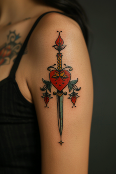This tattoo is a bold and striking design, featuring a vibrant red heart pierced by an elegant dagger. The dagger s hilt is adorned with intricate details and small floral elements, giving it an old-school, traditional tattoo feel. The symmetrical leaves and buds surrounding the heart add a touch of softness, balancing the sharpness of the blade. The heart s deep red contrasts beautifully with the sleek metallic look of the dagger, making it a powerful and eye-catching piece.