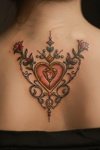This tattoo beautifully merges the symbolism of love and strength, featuring a vibrant red heart with a diamond facet design in the center. The diamond adds a brilliant shine to the heart, giving it a multi-dimensional, almost glowing effect. Surrounding the heart are delicate vines and small geometric elements, all of which enhance the design s elegance without overpowering the central image. The soft shading and vibrant colors make this tattoo visually stunning, while still maintaining a sense of balance and symmetry.