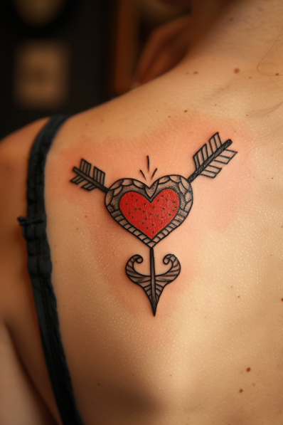 This tattoo is a fun and bold take on the classic arrow-through-the-heart design. The heart is simple yet striking with its bright red fill, while the black arrow that pierces through it adds a touch of edge and toughness. The thick, bold outlines give the design a graphic, almost cartoon-like feel, while the detailed patterns surrounding the heart give it a unique twist. It s small yet impactful, placed perfectly on the upper back where it can be shown off or easily hidden.