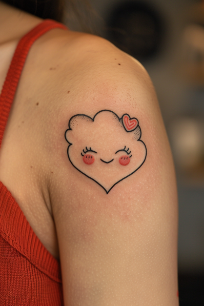 This tattoo is pure cuteness, featuring an adorable heart-shaped cloud with a sweet, smiling face. The blush-colored cheeks and tiny eyelashes give it a soft, friendly vibe, while the small, playful heart accent adds a fun pop of color. The simple black outlines and minimal shading keep the design light and cheerful, making it feel like a little piece of happiness inked right on your skin.