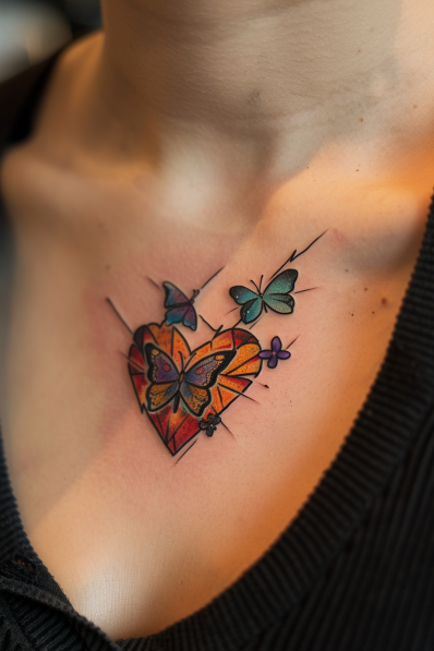 Now, this is a tattoo that truly pops! Featuring a geometric heart filled with a vibrant stained-glass-like design, it s a real eye-catcher. Inside the heart, there s a colorful butterfly taking center stage, while two more butterflies flutter outside, giving the tattoo an added sense of movement and life. The placement just below the collarbone makes it feel both delicate and bold at the same time. It s like a piece of art you can wear every day, and the colors? Stunning.