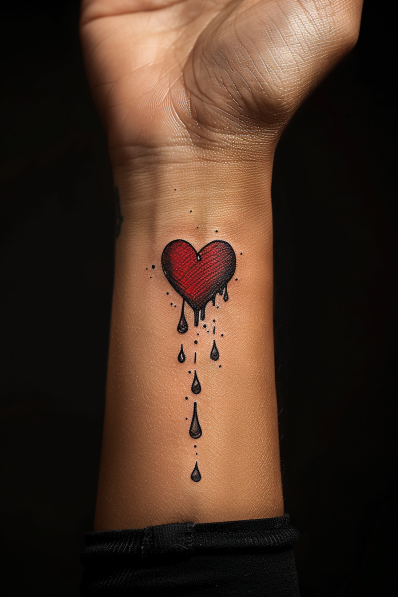 This tattoo delivers a bold and edgy look with a red heart that appears to be melting or dripping down the wrist. The heart has a rich, textured red color, while the black drips beneath it create a striking contrast. The droplets give the tattoo a dynamic and raw feel, as if the heart is literally pouring its emotions out. It s both dramatic and visually captivating, making it a powerful symbol of vulnerability or passion.
