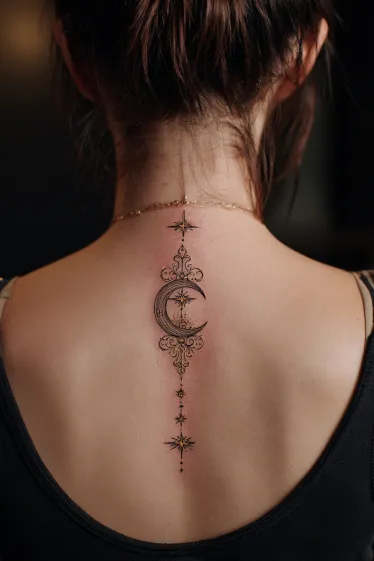 This tattoo showcases a delicate crescent moon set at the center of the spine, framed by ornate filigree details that give it a timeless and elegant look. The fine linework creates a lace-like effect, while small star accents cascade up and down the spine, tying the whole piece together in a graceful vertical flow. The design feels balanced, minimal, yet still full of celestial charm.