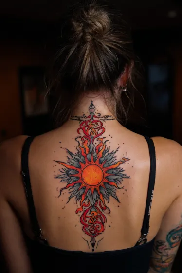 I think this tattoo is incredible because it carries so much energy and intensity. The colors make it impossible to miss, and the spine placement adds to its dramatic impact. To me, it feels empowering, almost like wearing pure strength and light on your back. It s the kind of tattoo that radiates confidence while still feeling beautifully artistic.