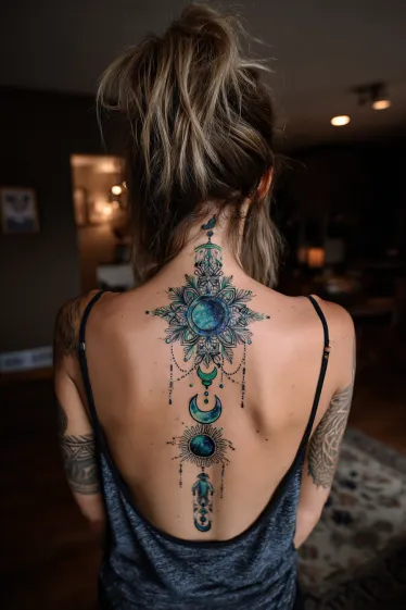 This tattoo cascades down the spine with a celestial mandala at the top, leading into crescent moons and glowing planets below. The design is richly detailed, with delicate ornamental patterns and jewel-toned blues and greens that make it shimmer like starlight. Small dots and fine lines connect each element, creating a flowing vertical composition that looks perfectly aligned with the natural curve of the back.