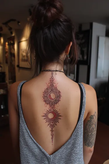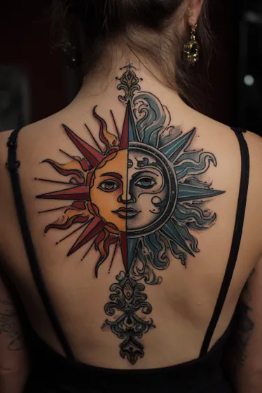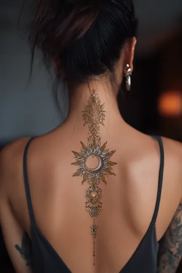 Ornamental Sun and Crescent Moon Spine Tattoo