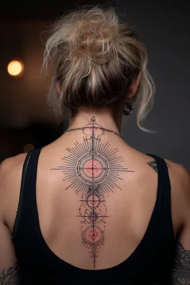 This tattoo aligns perfectly along the spine with radiant mandala-style suns glowing in warm shades of red and orange. Each circular shape is surrounded by fine dotted details and symmetrical linework that extend outward like beams of cosmic energy. The repeating pattern creates a harmonious flow down the back, giving the design both structure and a sense of endless expansion.