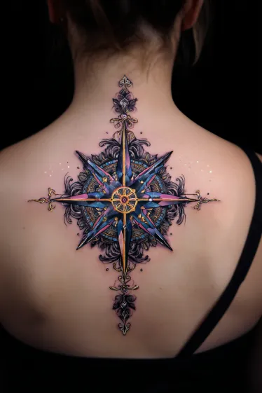 I think this tattoo is breathtaking because it blends artistry with meaning. The colors glow beautifully and the balance of sharp points with soft ornamental details makes it look both fierce and feminine. To me, it feels like wearing a cosmic crown on your back, and I love how it instantly stands out as a statement piece.