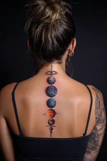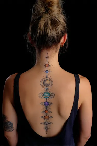 I think this tattoo is such an incredible piece because it s both artistic and symbolic. It feels like carrying the universe along your back, and the colors make every planet pop against the skin. To me, it s the kind of tattoo that tells a story about balance, wonder, and connection to something far bigger than ourselves, while still looking elegant and feminine.
